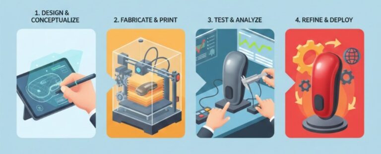 Industrial 3D printing workflow showing CAD design to finished prototype using FDM, SLA, MJF, and SLM technologies.